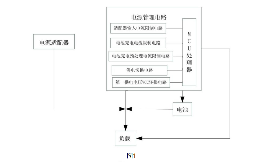 本申請實施例提供了一種電源充放電管理系統,其特征在于:包括電源適配器、電池和電源管理電路,電源適配器與外部電源連接,電源管理電路用于在電池電量滿足負載設備的用電需求時,選擇電池為其供電,在電池電量不滿足負載設備的用電需求時,切換至電源適配器的第一輸出端,由外部電源供電,電源管理電路還與電源適配器的第二輸出端連接,由與電源適配器連接的外部電源與電源管理電路供電,在電池電量不足時,通過電源管理電路為電池充電。本實施例的負載所需的用電電壓VCC可以通過電源管理電路由電池或適配器供電,并且當電池電壓下降到充電閾值(VREF)以下時,可通過適配器為電池充電,電路結構簡單,提高了電源管理的效率。